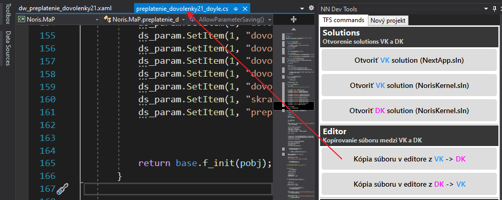 Prekopíruje aktuálny súbor vývojovej verzie otvorený vo Visual Studio do aktuálnej distribučnej verzie. Takto prekopírovaný súbor je možné potom pred TFS Checkinom skontrolovať a zrevidovať.