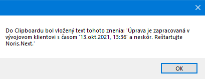 Po vykonaní úpravu v Noris.Next je potrebné užívateľovi zaslať informáciu o zmene a to aj s časovým údajom verzie, v ktorej sa úprava vyskytuje. Inak bude užívateľ hľadať úpravu v starej verzii a reklamovať. Táto funkčnosť vráti aktuálnu časovú značku vývojového klienta, a nakopíruje text do Clipbordu na využitie v emaili: